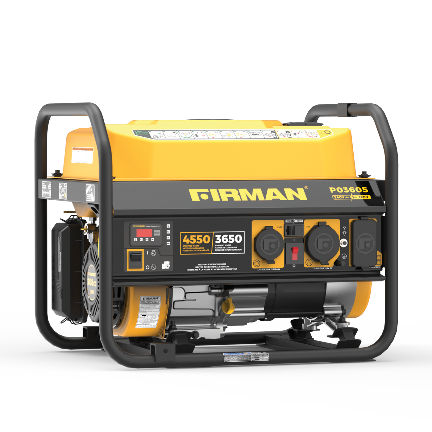 The FIRMAN P03605 is a durable, RV-ready portable gasoline generator built for camping, job sites, and emergency home power. Powered by a 208cc Max Pro engine with a Phoenix Fat Head Block, it delivers 4550 starting watts and 3650 running watts while operating at a quiet 67 dB. Its 5-gallon steel tank provides an impressive 14-hour runtime at 50% load, making it one of the longest-running generators in its class. With clean power output, 120/240V capability, and multiple covered outlets, it reliably supports tools, appliances, and sensitive electronics. It also includes safety-focused features such as automatic low-oil shutoff and a USDA-certified spark arrestor for safer use in forested and rugged environments.