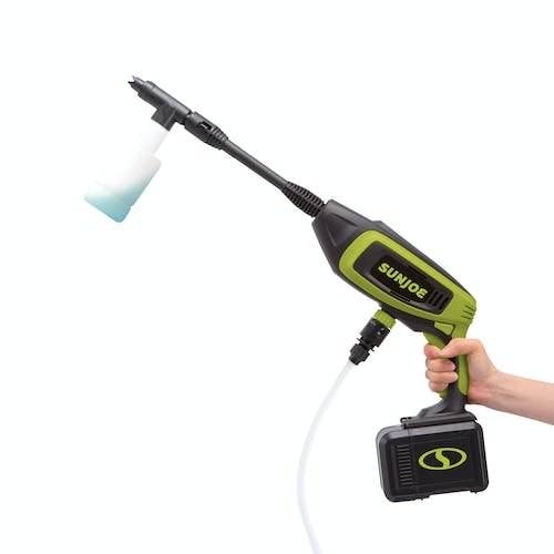 CLEAN ON-THE-GO, WITH JOE. Meet the cutting-edge in cordless cleaning tech with the portable, pressurized, power cleaning system from SUN JOE. Perfect anywhere power is at a premium, it’s ideal to take a quick rinse on the road or a mini power wash wherever your travels take you. Simply insert the battery (Sold Separately) , tap into a water source, and go! Equipped with a 20-ft siphon hose, 24V-PP350-CT draws water from any fresh water source — like a bucket, pool, pond, or directly from the spigot — so you can quickly clean off the car, truck, boat, RV, or pressure wash the porch, patio, around the pool and other outdoor spaces. The included 5-in-1 nozzle offers five selectable spray patterns — switch from 0 powerful pinpoint jet to 40 fan spray and gentle shower — with just a twist of the wrist. Providing more cleaning power than conventional garden hoses, SUN JOE blasts through mud and caked on messes with enough flow to quickly rinse away dirt and debris. And for those really stubborn stains in tight spaces like wheel wells and trim, the included utility bristle brush easily breaks down grease, grime, oil and mud without damaging paint, trim, and glass. SUN JOE’s sleek, lightweight design — less than 7 lbs! — makes it the perfectly portable camping companion and stores easily in the trunk of your car or in your boat or RV. So, tap in to unbeatable cleaning power that fits in the palm of your hand, and Go With Joe: 24V-PP350-CT from SUN JOE. GET EQUIPPED.