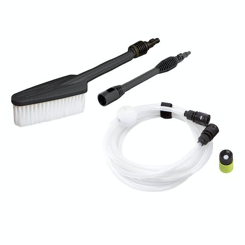 • 4-piece accessory kit includes: utility bristle brush to scrub away dirt and clean wheel wells, 11.9-inch extension wand, 20-ft siphon hose, garden hose adapter to connect directly to the spigot
