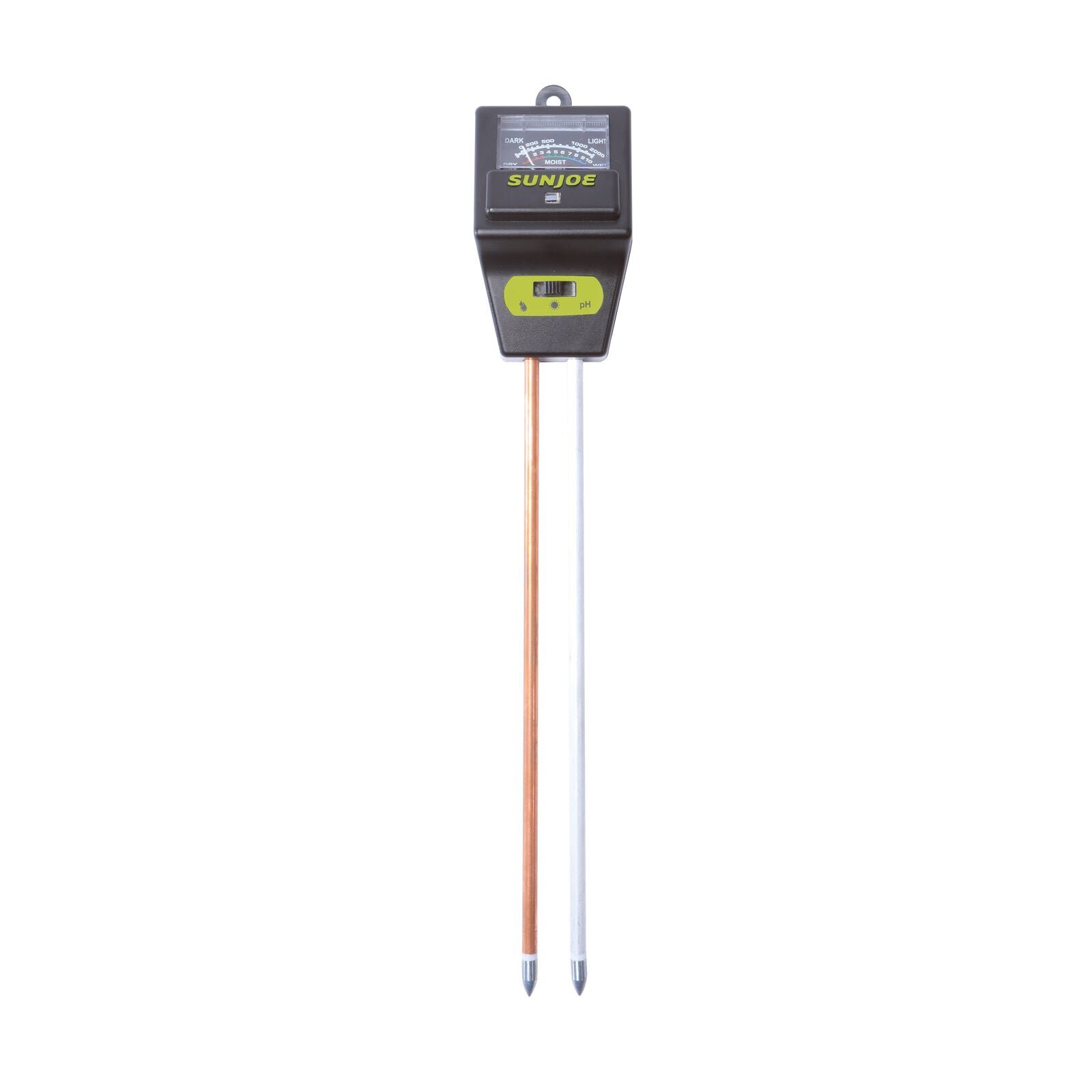 GROW with JOE. Keep your soil plus plants in peak health with the convenient SJ-MMPH1 3-IN-1 SOIL METER from Sun Joe. The secret of great gardens and gardeners, this powerful 3-in-1 tool tests for proper moisture, pH and sunlight for healthier soil plus happier plants. Designed for easy indoor/outdoor use, it’s great for testing condition and plant care in lawns, gardens, greenhouses and homes – no batteries required. Just water before testing and select your desired soil testing mode and you’re all set. When finished, simply remove the probes from the soil and wipe them clean.