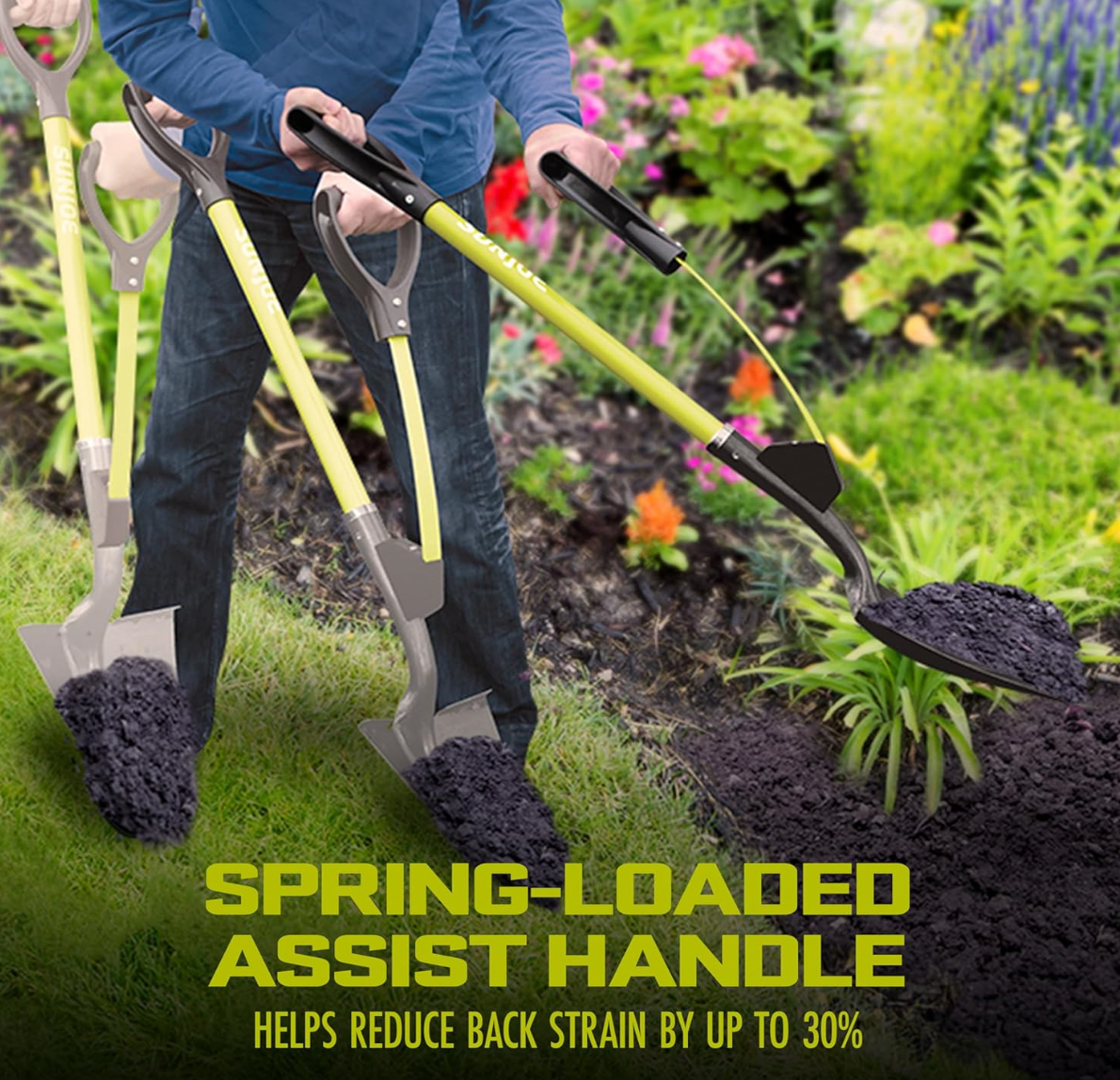 SPRING IT AND FLING IT! Dig in – and give your back a break in the yard garden, and shovel smarter – not harder! No more heavy lifting or lower-back strain with the Sun Joe Shovelution 40â Spear Head Utility Digging Shovel. The rugged, forged steel point 9-inch blade easily pierces both sod and soil, while the ergonomically-designed spring-assist handle sends lifting leverage to the lower hand to easily lift heavy loads of dirt and mulch, or dig up shrubs, plant trees and cut trenches with minimal effort. Shovelution greatly reduces the effort, strain and potential injury involved in shoveling, using the powerful muscles of your upper body to do the lifting and throwing to reduce back strain by up to 30%, so you can lift more, and throw farther. Just spring it and fling it! SHOVELUTION captures the expended energy from throwing sod and soil, and rapidly recoils to instantly reset the shovel, ready for the next load. So, get a handle on your garden chores and Go With Joe â and dig in with the ultimate strain-reducing shovel.