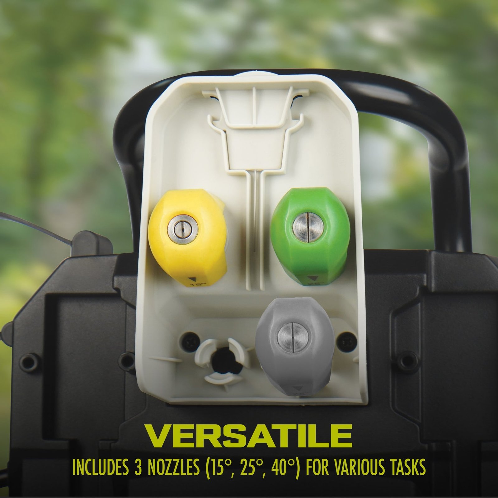 - VERSATILE PERFORMANCE: Tackle a range of cleaning tasks with three quick-connect spray nozzles (15°, 25°, 40°) for customizable pressure